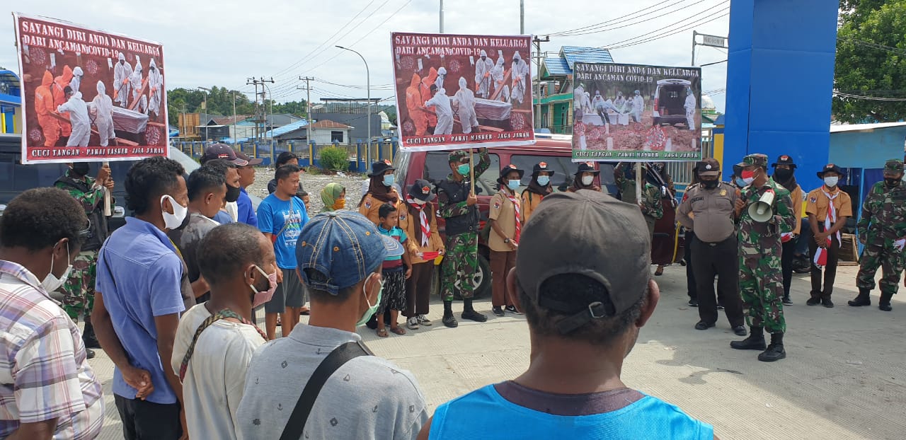 MANOKWARI– Upaya Kodim 1801/Manokwari dalam rangka memutuskan rantai penyebaran Corona Virus Disease (Covid -19) di Kabupaten Manokwari dilakukan dengan cara gencar mengunjungi pusat keramaian.