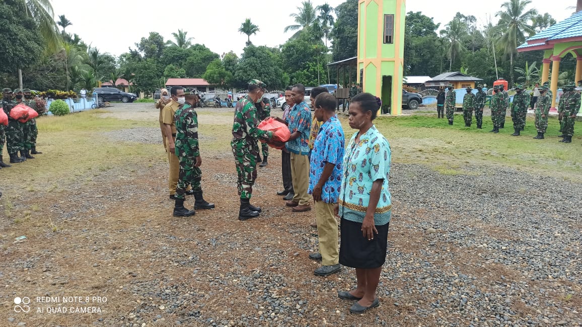 Dalam kesempatan tersebut, secara simbolis Dandim juga menyalurkan bantuan paket sembako sebanyak 100 lebih kepada warga di Kampung Atibo. Sebagai wujud kasih mengasihi antar sesama.