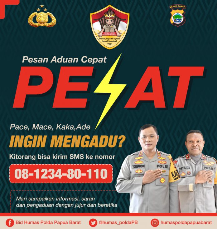 MANOKWARI – Masyarakat di Papua Barat diminta untuk tidak sungkan mengadu melalui layanan SMS pengaduan hasil inovasi Polda Papua Barat. Sebab, dipastikan layanan SMS pengaduan itu akan secara cepat ditindak lanjuti.