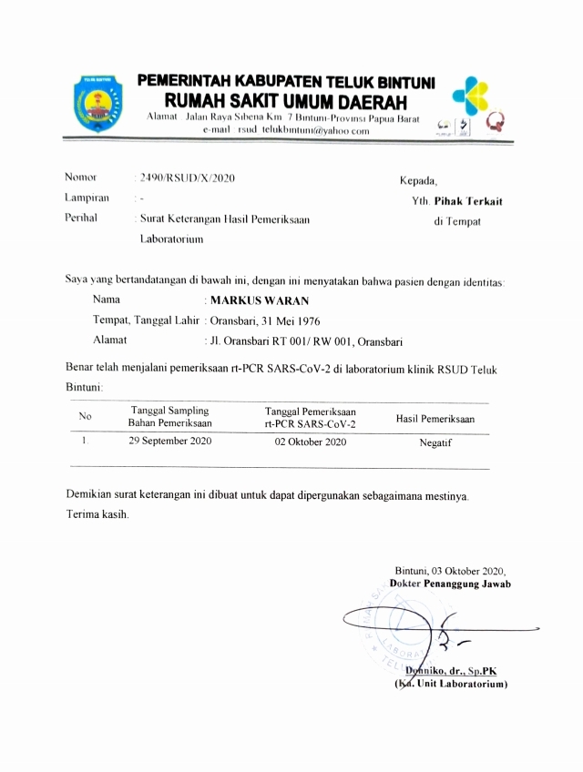 Sementara itu, Balal Calon Bupati Markus Waran yang dihubungi via whatsapp, Minggu (4/10/2020) membenarkan telah melihat surat hasil pemeriksaan tersebut, yang menyatakan dirinya Negatif Covid-19. “Dari RSU Provinsi juga sudah negatif. Nanti sebentar tim dari Bintuni akan antar hasil dan serahkan ke saya,” demikian tulis Markus Waran.