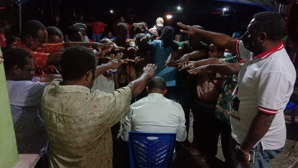 MANOKWARI–Calon Bupati Manokwari Hermus Indou didoakan 13 Hamba Tuhan dari GPKAI Majelis Daerah (MD) Indabri. Belasan hamba Tuhan itu mendoakan dengan menumpangkan tangan di atas kepala Hermus Indou saat hadir memenuhi undangan keluarga besar Arfak di Kampung Indisey, Distrik Warmare, Sabtu (3/10/2020).