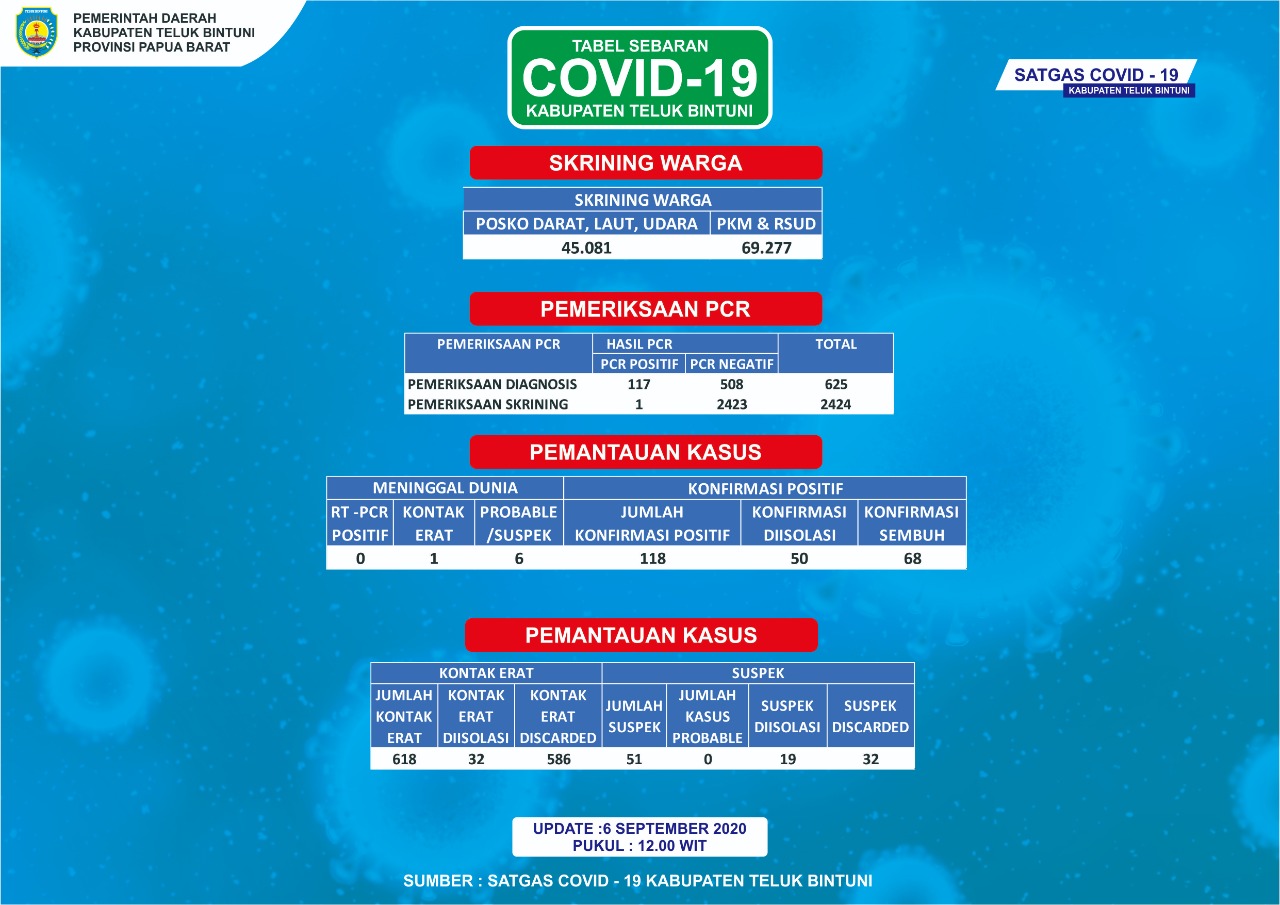 Sesuai rilis Juru Bicara Tim Satgas Covid-19 Kabupaten Teluk Bintuni, dr Wiendo melaporkan pada Sabtu (5/9/2020) tercatat sebanyak 5 warga terkonfirmasi virus korona, 4 dari Distrik Bintuni dan 1 Manimeri.