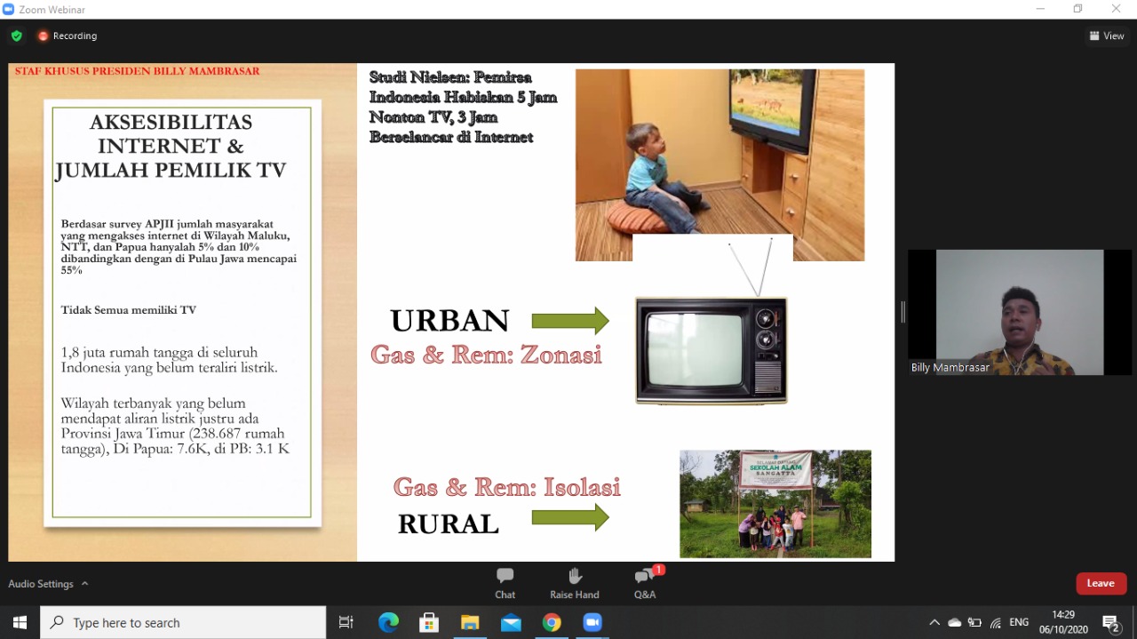 “Dampak Covid-19 ini terjadi di seluruh dunia terhadap pendidikan dan hampir seluruh sekolah menerapkan sistem daring. Maka, Jika kita tidak melakukan solusi yang benar, tentu akan menggagalkan bonus demografik yang terjadi. Daerah seperti tempat saya Berasal, yaitu Papua dan Papua Barat mengalami dampak yang parah. Saya rasa, kita harus melakukan hal-hal pragmatis, agar tidak terjadi ketimpangan kualitas manusia antar daerah” ungkap Billy.