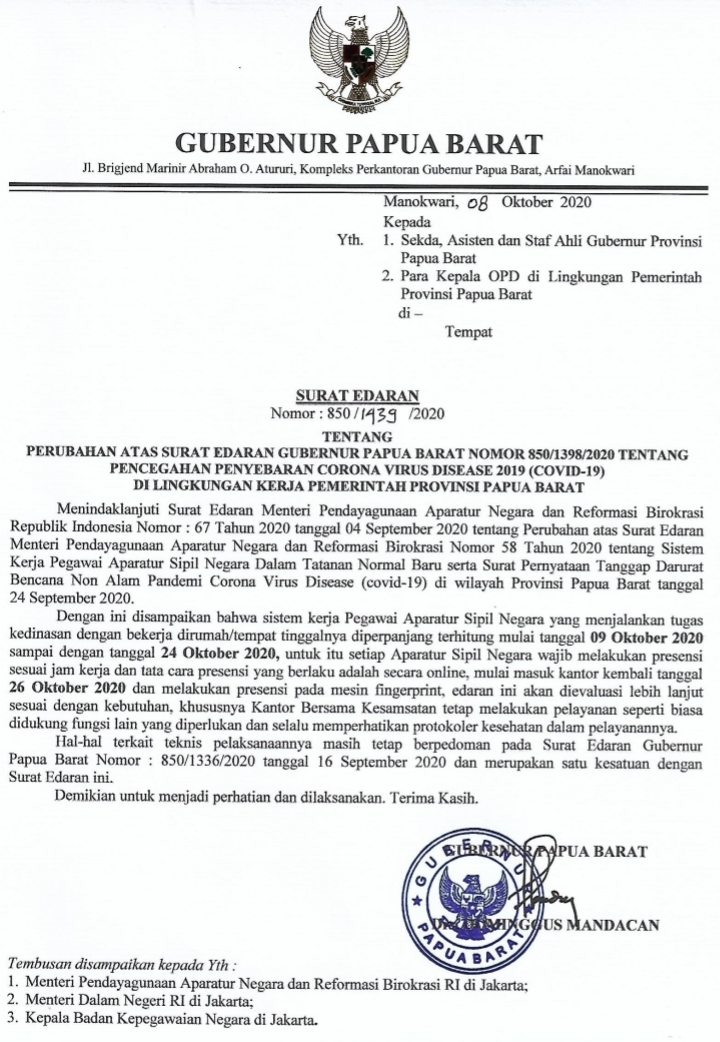 Surat edaran gubernur Papua Barat ini menindaklanjuti surat baru Edaran Menpan RB Tjahjo Kumolo nomor 67 tahun 2020 pada 4 September 2020.(kp1)