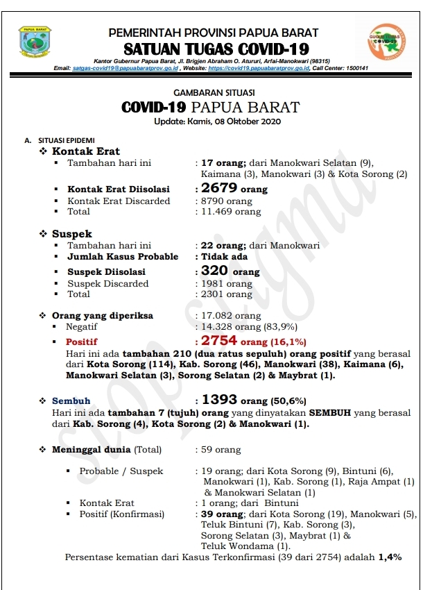 Dengan penambahan tersebut, konfirmasi positif Covid-19 di Papua Barat total keseluruhan menjadi 2754 kasus. Dan yang sudah sembuh 1393 orang. Meninggal dunia 59 orang.