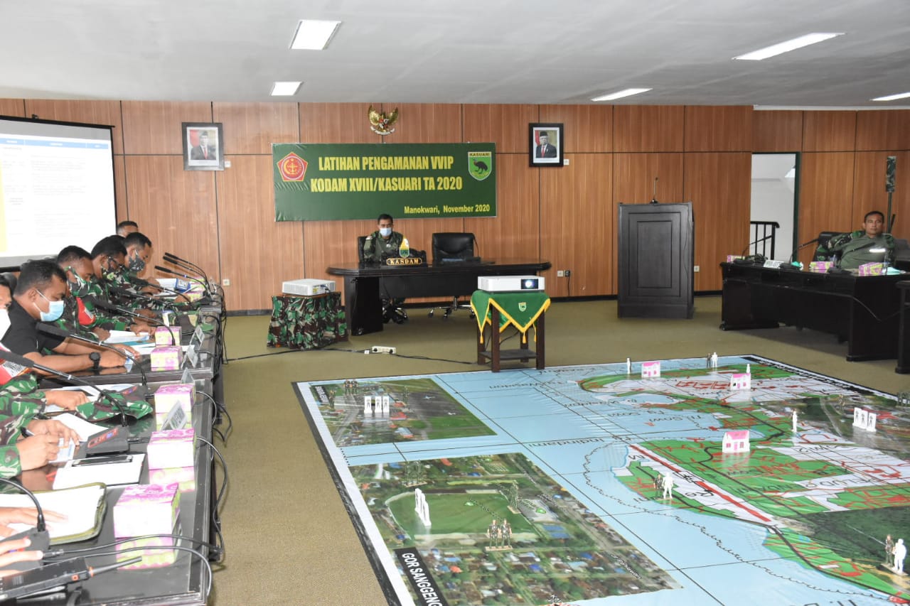 MANOKWARI–  Tactical Floor Game (TFG) dalam pelaksanaan Latihan Pengamanan VVIP Kodam XVIII/Kasuari Tahun 2020, Rabu (11/11/2020) digelar di Ruang Yudha Makodam XVIII/Kasuari, Trikora Arfai 1, Manokwari ,dipimpin Kasdam XVIII/Kasuari, Brigjen TNI Ferry Zein.