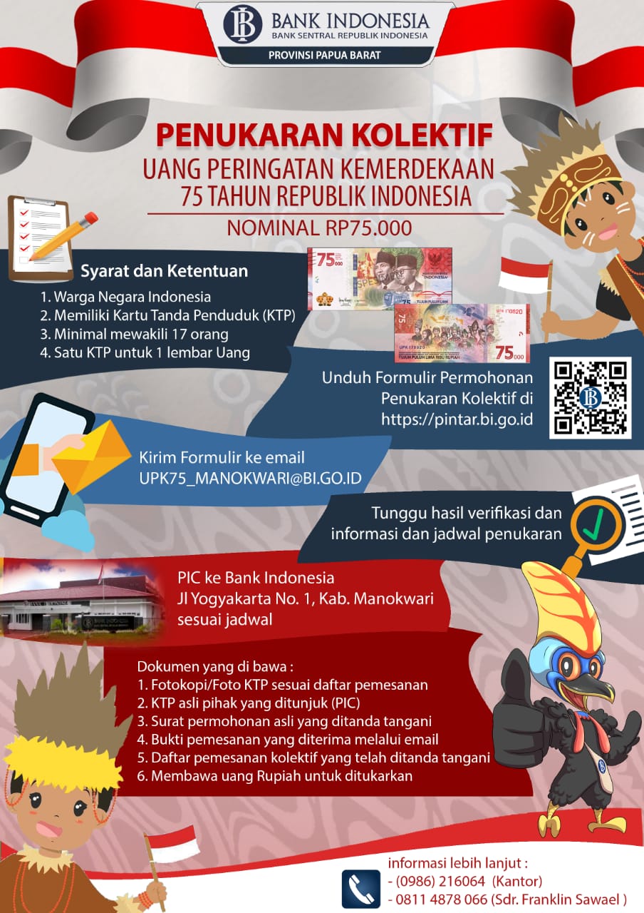 “Formulir penukaran kolektif dapat diunduh di tautan website tersebut di atas atau dapat menghubungi petugas di Kantor Perwakilan Bank Indonesia Provinsi Papua Barat maupun contact person sebagaimana tercantum dalam pamflet/brosur terlampir,” ungkapnya.
