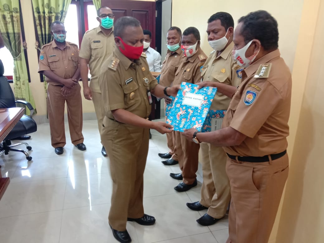 BINTUNI – Bupati Teluk Bintuni Petrus Kasihiw menyerahkan dokumen kode register 145 kampung persiapan kepada 28 kepala distrik, di Kantor Bupati, SP 3, Distrik Manimeri, Senin (14/9/2020).