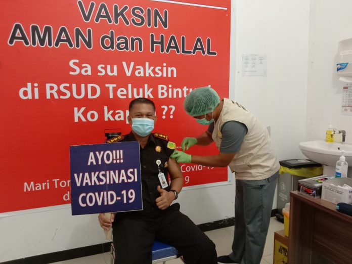 BINTUNI – Pemerintah Kabupaten Teluk Bintuni menggelar Vaksinasi Covid-19 tahap ke dua, bagi tokoh publik dan tenaga kesehatan (Nakes) yang sudah menerima vaksin Sinovac tahap pertama. Vaksinasi Tahap ke dua di Teluk Bintuni bagi tokoh publik dan sejumlah Nakes dilaksanakan di Rumah Sakit Umum Daerah (RSUD) Bintuni, Distrik Bintuni. Senin (15/2/2021).