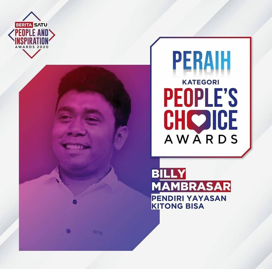 JAKARTA–BeritaSatu TV menggelar malam perayaan anugerah _People and Inspiration Awards (PI Awards) 2020 pada Sabtu, 12 Desember 2020. Perayaan ini sebagai bentuk apresiasi kepada sejumlah insan hebat yang terus menginspirasi warganet. Setidaknya sebanyak 13 pejuang kemanusiaan meraih penghargaan dalam berbagai bidang kategori, salah satunya adalah Staf Khusus Presiden Billy Mambrasar sebagai pendiri Yayasan Kitong Bisa untuk kategori pilihan pemirsa atau People Choice Awards.