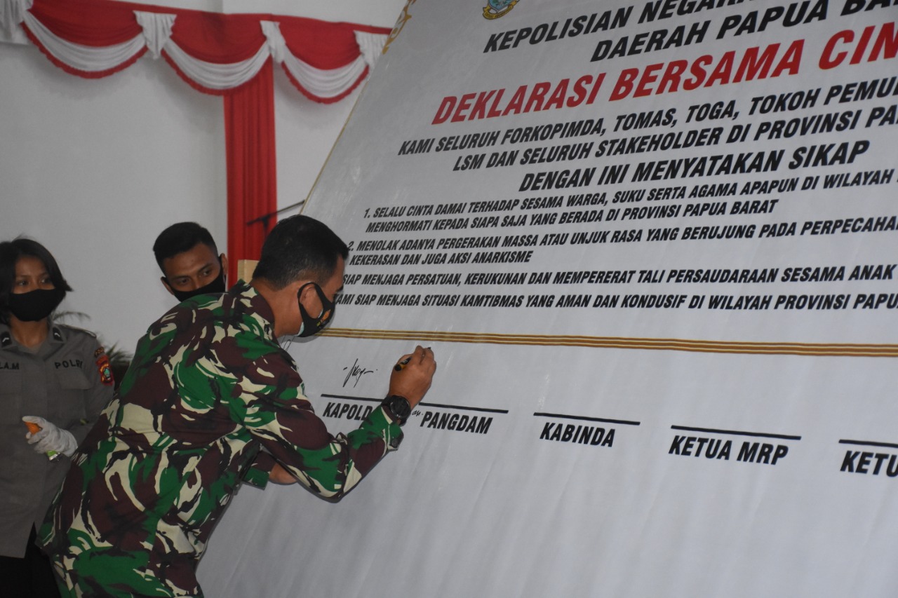 Dalam acara Deklarasi Damai dan Tolak Anarkisme yang dihadiri Gubernur Papua Barat, Kapolda, Kabinda, Kajati, dan para Bupati se Provinsi Papua Barat, para tokoh agama, tokoh adat, tokoh masyarakat, serta pimpinan Ormas dan Pemuda Papua Barat ini dilakukan penandatanganan Deklarasi Bersama Cinta Damai.(rls/red)
