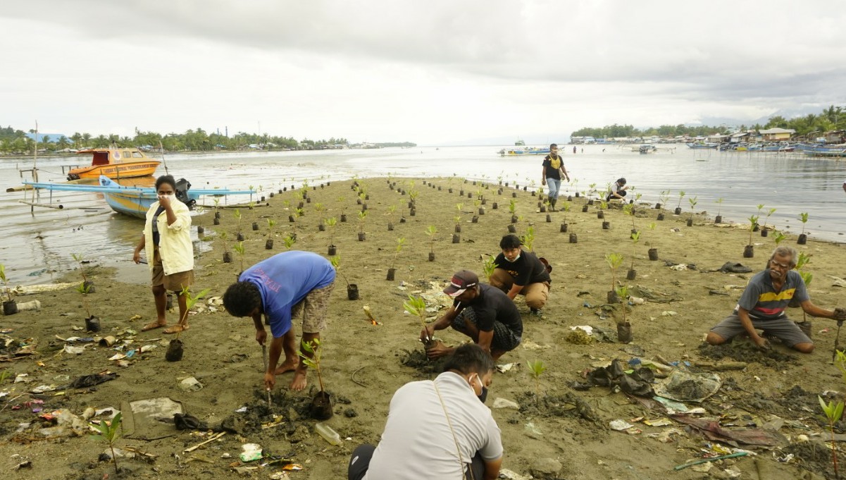MANOKWARI, PAPUAKITA.com Sebanyak 300 bibit mangrove ditanam di pesisir Teluk Sawaibu, Manokwari, Minggu (18/10/2020). Aksi sosial ini dilakukan oleh komunitas peduli lingkungan yang terdiri atas gabungan Ormas dan komunitas yang ada di Kabupaten Manokwari.