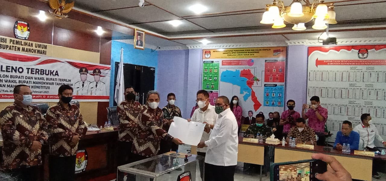 MANOKWARI – Komisi Pemilihan Umum (KPU) Manokwari menggelar pleno terbuka penetapan pasangan calon bupati dan wakil bupati terpilih pasca putusan Mahkamah Konstitusi pada Sabtu (20/2/2021).