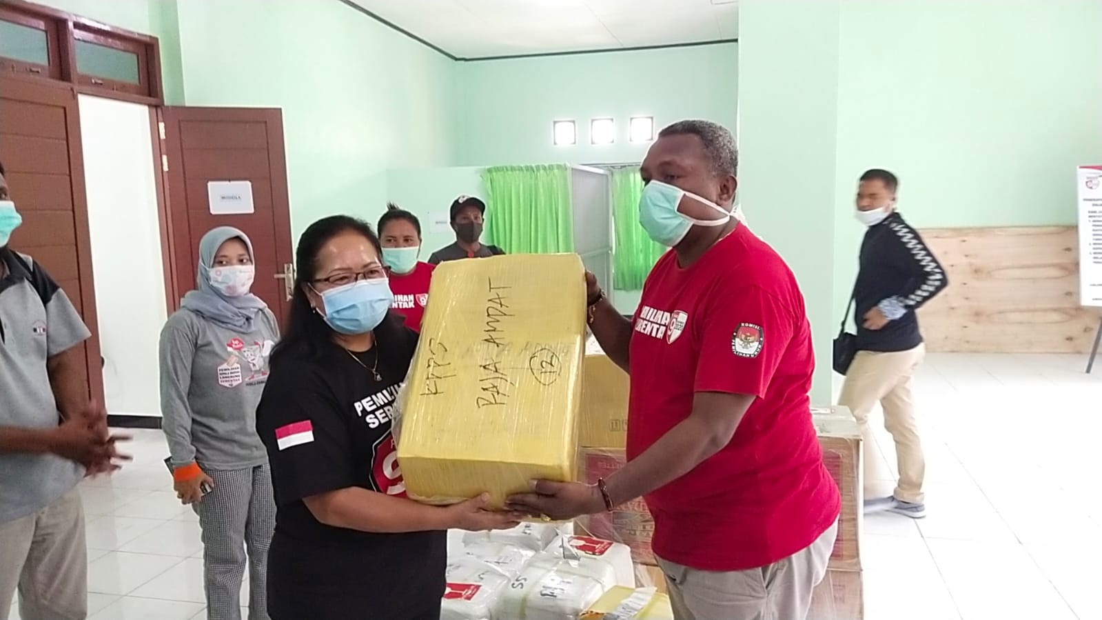 WAISAI -Komisi Pemilihan Umum (KPU) Kabupaten Raja Ampat menyerahkan logistik, yakni Alat Protokol Kesehatan (APK) dan Surat suara kapada Sekretariat KPU. Penyerahan dilakukan oleh Ketua KPU Raja Ampat, Steven Eibe, S.STP secara langsung kepada Sekretaris KPU Raja Ampat, Sutini, S. IP, bertempat di kantor KPU, Waisai, Jumat (20/11/2020).