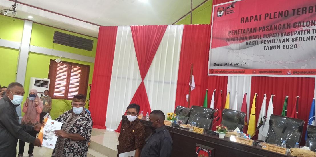 Dedimus Kambiya, Devisi Hukum membacakan berita acara penetapan pasangan calon bupati dan wakil bupati dan Menetapkan pasangan calon bupati dan wakil bupati kabupaten Teluk Bintuni tahun 2020 Ir Petrus kasihiw dan Matret Kokop SH dengan perolehan suara (21.153) pada pleno rekapitulasi tanggal 15 Desember 2020.