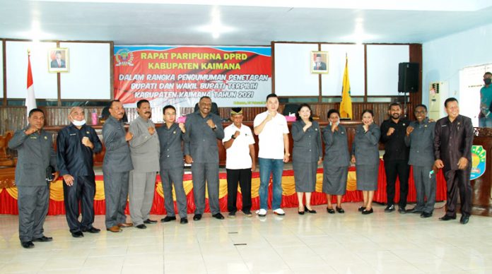 KAIMANA – Dewan Perwakilan Rakyat Daerah (DPRD) Kabupaten Kaimana menggelar rapat paripurna penyampaian pengumuman penetapan Bupati dan Wakil Bupati terpilih Kabupaten Kaimana Tahun 2021, serta pengumuman akhir masa jabatan Bupati dan Wakil Bupati Kaimana masa jabatan 2016-2021. Selasa (23/2/2021).