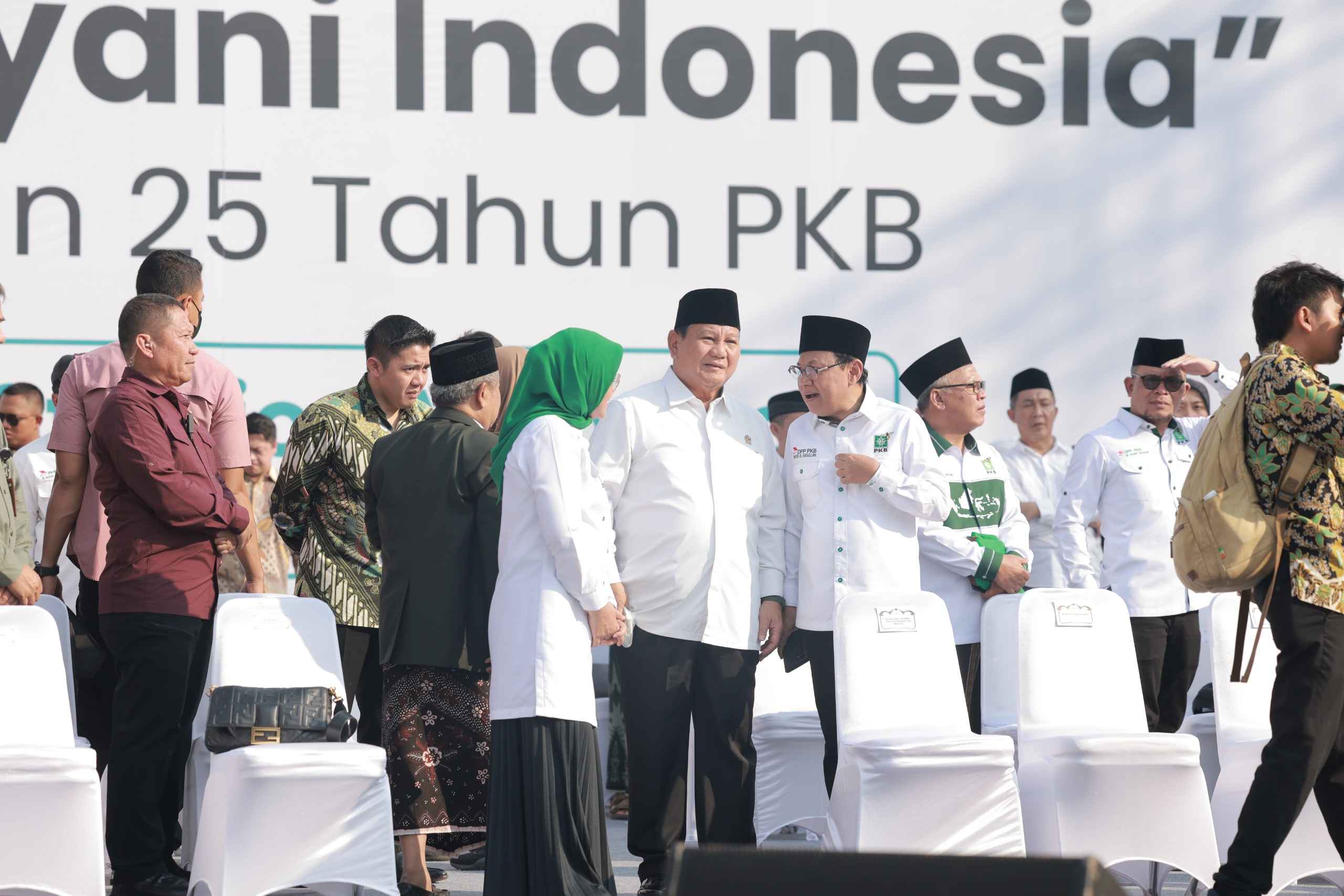 “Telah hadir bersama kita, Ketua Umum Gerindra Pak Haji Prabowo,” kata Muhaimin disambut tepuk tangan puluhan ribu kader PKB.