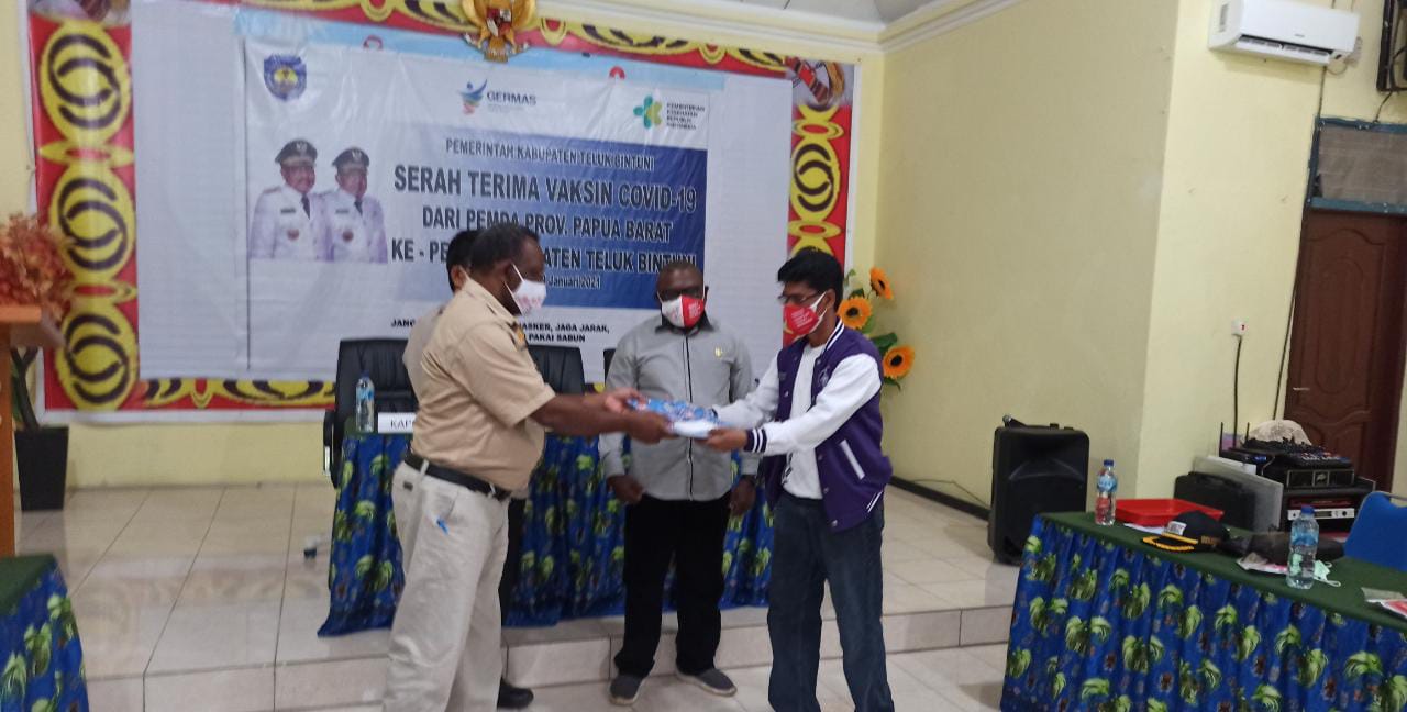Setibanya di Bintuni, dilakukan serah terima vaksin Covid-19 dari pemerintah daerah provinsi Papua Barat kepada pemerintah kabupaten Teluk Bintuni di Aula Dinas Kesehatan, KM5  Distrik Bintuni Barat.