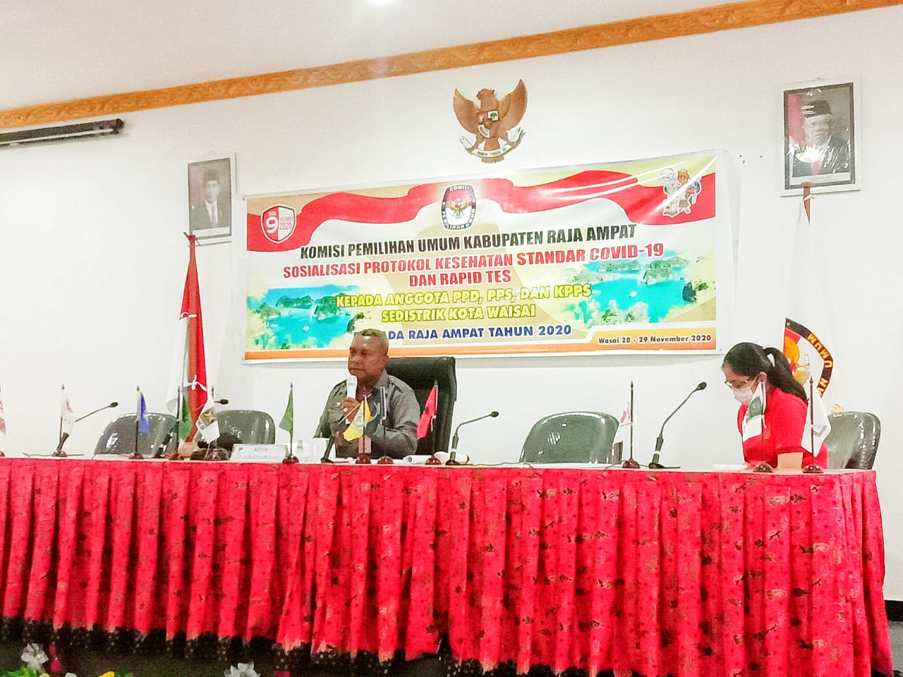 WAISAI – Komisi Pemilihan Umum (KPU) Kabupaten Raja Ampat menggelar sosialisasi protokol kesehatan standar Corona Virus Desease 2019 (Covid-19) dan rapid test kepada anggota PPD, PPS , dan KPPS Se-Distrik Kota Waisai, Kabupaten Raja Ampat. Sosialisasi protokol kesehatan standar Covid-19 dan rapid test, bertempat di aula kantor KPU Raja Ampat, Waisai, Senin (30/11/2020).