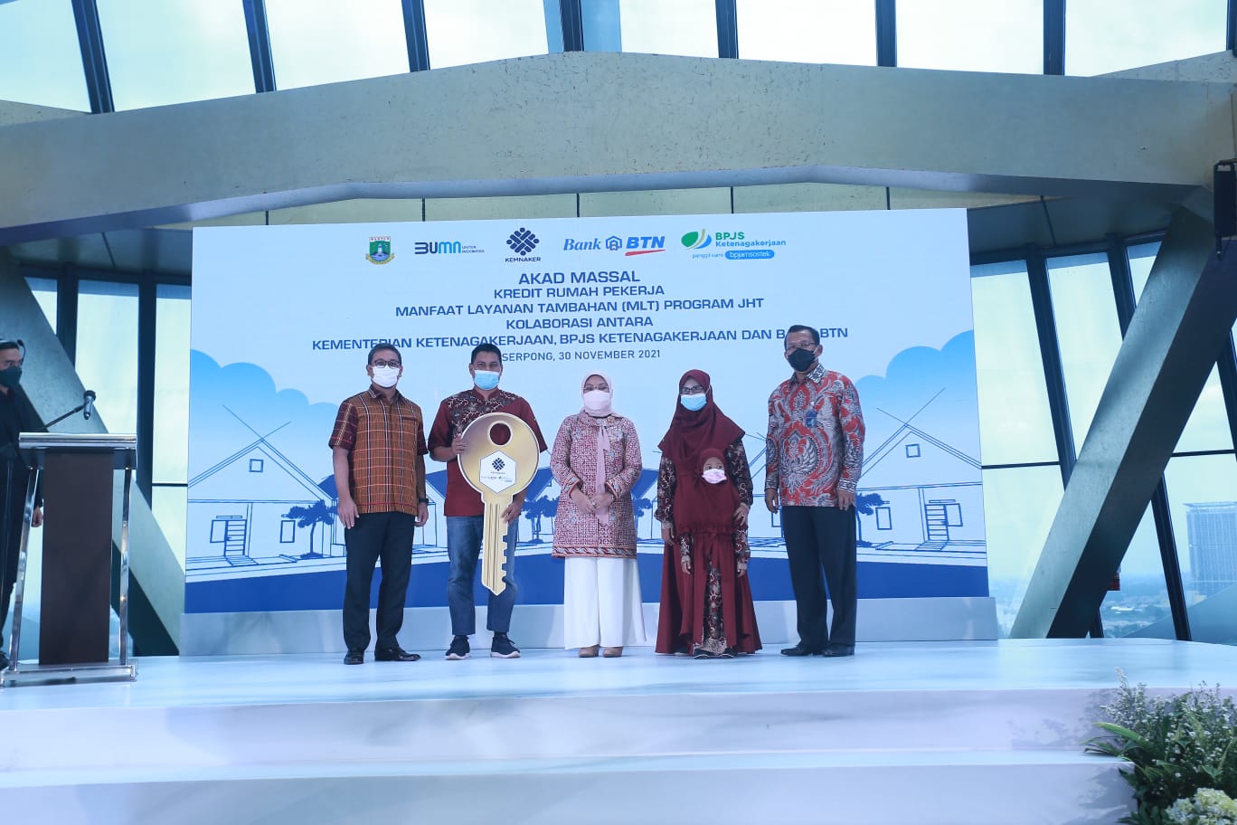 SERPONG – BPJS Ketenagakerjaan (BPJAMSOSTEK) bersama Kementerian Ketenagakerjaan RI dan PT Bank Tabungan Negara (Persero) menyelenggarakan akad kredit massal bagi 150 pekerja yang mendapatkan Manfaat Layanan Tambahan (MLT) Program Jaminan Hari Tua (JHT) dari BPJAMSOSTEK.