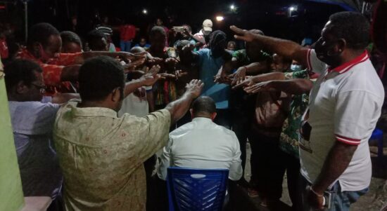 MANOKWARI–Calon Bupati Manokwari Hermus Indou didoakan 13 Hamba Tuhan dari GPKAI Majelis Daerah (MD) Indabri. Belasan hamba Tuhan itu mendoakan dengan menumpangkan