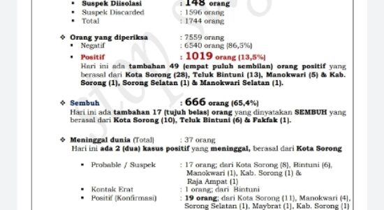 MANOKWARI – Hari ini Provinsi Papua Barat ada penambahan 49 orang positif, yang berasal dari Kota Sorong 28 orang, Teluk Bintuni 13
