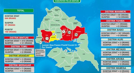 BINTUNI– Update terbaru, Jumat (11/9/2020), Kasus Covid-19 di Kabupaten Teluk Bintuni tembus angka 150. Ada penambahan 13 dan 6 pasien dinyatakan sembuh.