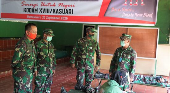 MANOKWARI— Menyambut Hari Ulang Tahun (HUT) ke-75 TNI tahun 2020, Kodam XVIII/Kasuari menggelar Bakti sosial (Baksos) donor darah di Lapangan Tembak Kodim