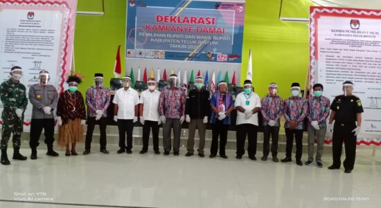 BINTUNI – Pasangan calon Bupati dan Wakil Bupati Kabupaten Teluk Bintuni mengikuti deklarasi kampanye damai, yang digelar oleh KPU Teluk Bintuni di