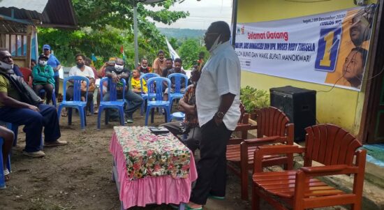MANOKWARI—Calon Bupati Manokwari, Sius Dowansiba melakukan kampanye terbatas di wilayah Brawijaya, Selasa (3/11/2020). Dalam tatap muka bersama warga, Sius Dowansiba menjelaskan program